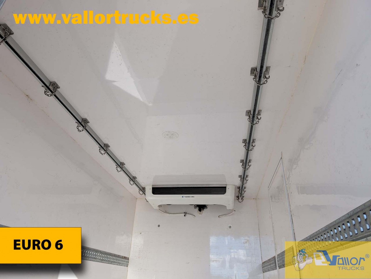 | Aire acondicionado, radio, control de tracción, control de crucero, sistema de frio Thermo King V500 Max y caja Tecnove FRCX 02/2028 con ganchos en el techo. |